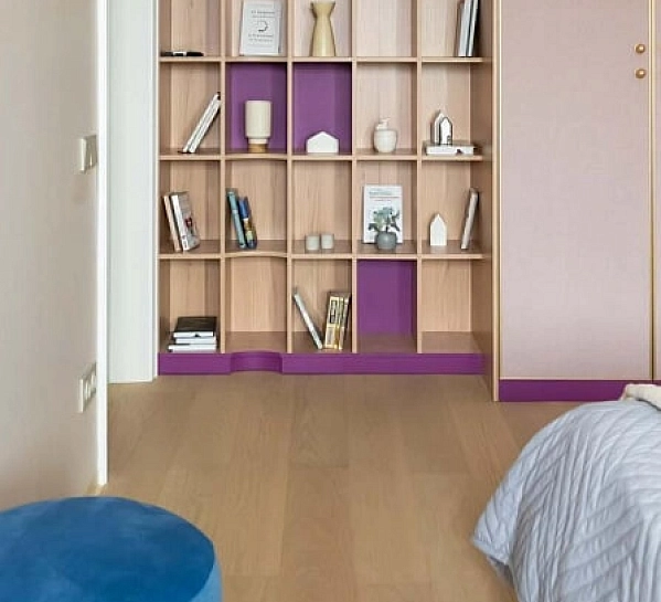 SPC-паркет устойчив к царапинам, влаге, не боится перепадов температур и идеально подходит для семей с детьми. В проекте он уложен на листовую подложку, снижающую ударный шум и пропускающую воздух.